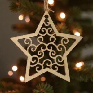 Dodaj swoim świętom odrobiny luksusu i wyrafinowanej elegancji z naszą wyjątkową bombką ażurową. Ta klasyczna, pięcioramienna gwiazda (o wymiarach ok. 80×80 mm) została wypełniona misternym, wirującym ornamentem, który przywodzi na myśl barokowe zdobienia lub szlachetną, ręcznie robioną koronkę. To wzór, który przepięknie i subtelnie filtruje światło lampek choinkowych, tworząc magiczną, ciepłą atmosferę w Twoim domu.